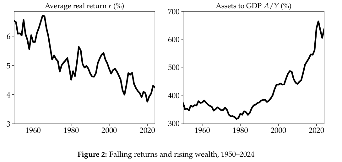From 1950 to 2024, AMRS show that asset demand decisively “won the race” in the US. Aging populations, rising inequality, and slowing growth all increased the desire to hold assets by 415% of GDP, according to their estimation. Asset supply rose by only 31% of GDP. The result was a secular run-up in asset prices, that is, a large fall in the long-term real interest rate.