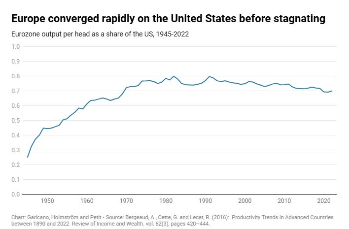 However around 1980, this unprecedented growth period ended. While the United States maintained a remarkably constant 2 percent growth rate in average income, the European core economies decelerated, slowly and then sharply. Since 1995, Europe’s average annual growth has been just 1.1 percent; since 2004, it has been a mere 0.7 percent – all while the United States has continued on its steady track. By 2022 the relative gap in output per head has returned to where it was in 1970. Decades of convergence were surprisingly wiped out.4