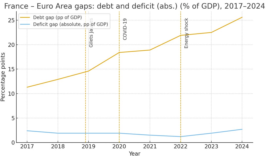 Macron’s government consistently spent more as a share of total output than any other OECD member, with the public sector accounting for over 57% of GDP in 2024. The telling trend is France’s divergence from its neighbors. When Macron took office, France’s debt-to-GDP ratio was 11 percentage points above the Eurozone average; by 2024, that gap had increased to 25 points. Public debt is set to hit 116% of GDP in 2025 and the deficit is set to double the EU average.