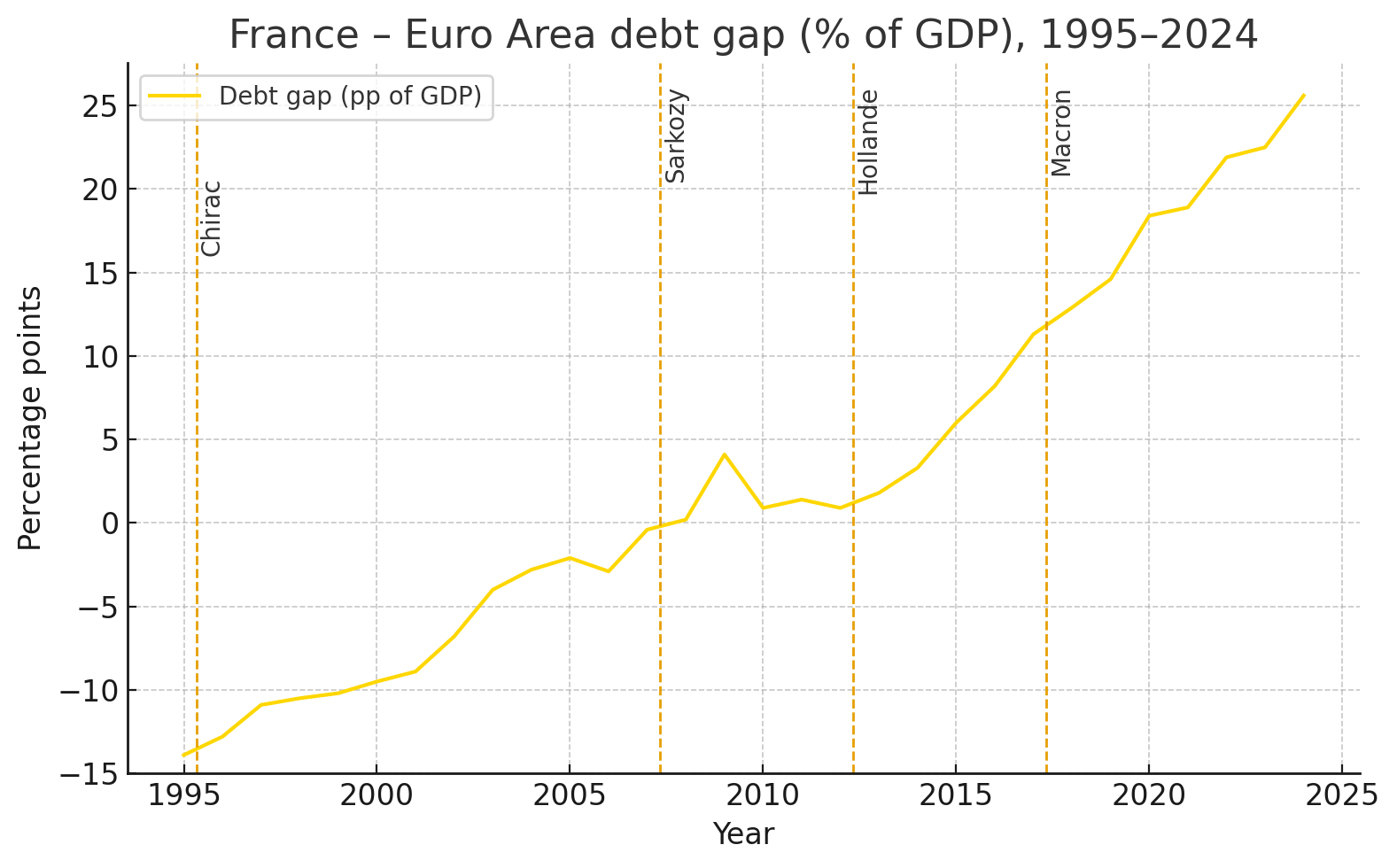 France’s fiscal stance under Macron reflects continuity with recent trends, rather than any break with the past. The Stability and Growth Pact sets a 3% deficit and a 60% debt reference. Since 2002, France has breached the limits every year, and the deficit limit every year except two.1 More telling, France’s deficit has exceeded the Eurozone average every single year since 2002. Its public debt has grown faster than its peers’ since 1995, with only a brief pause under President Sarkozy (see chart below).