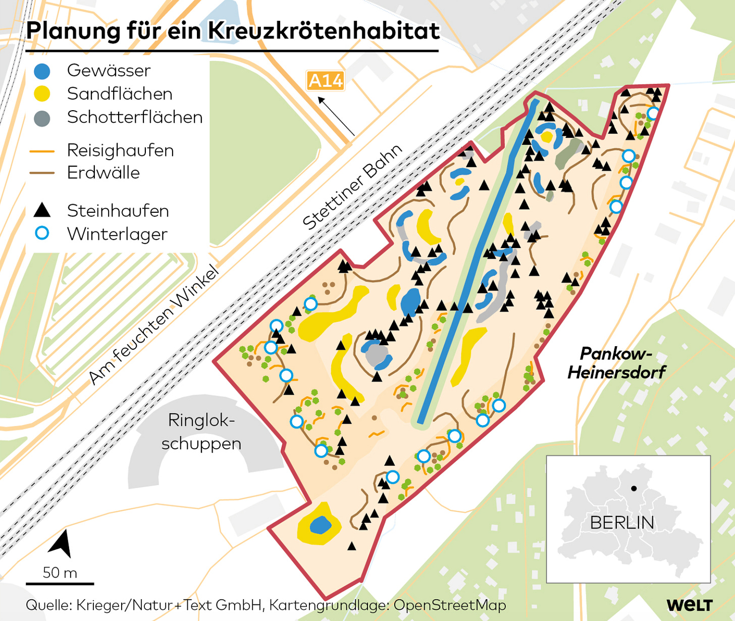 Unfortunately, construction at this site has been blocked since 2022, after the Berlin administrative court ruled that it was illegal to move the natterjack toads who live there. The natterjack toads have not been in Berlin for a long time: they only arrived in 1997, likely by riding along with a gravel truck. Only a few hundred of these toads live at this site. But, as they are listed in Annex IV of the EU’s Habitats Directive, it is illegal to capture or kill them, and, under Germany’s implementation of the directive, ‘significantly disturb’ them by ‘deteriorating the conservation status of the local population of a species’.1
