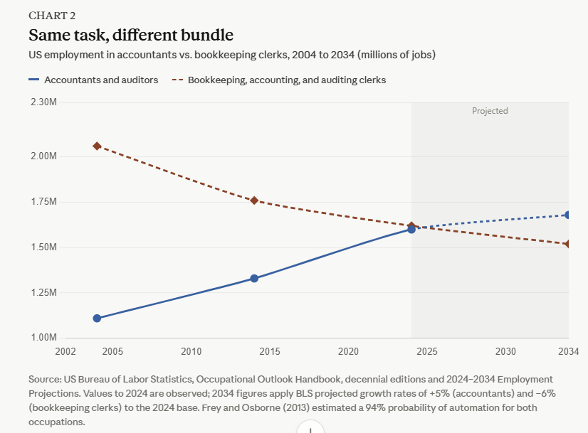 Most of the individual tasks that make up accounting involve the diligent completion of spreadsheets. These tasks individually seem easy to replace. In 2013, a study by Carl Frey and Michael Osborne put the probability that accountants and auditors would be automated at 94 percent. A decade later, the US Bureau of Labor Statistics counts 1.6 million accountants and auditors employed, median pay of $81,680, and projects the occupation to grow another 5 percent through 2034, faster than the average for all jobs. By contrast, the BLS category “bookkeeping, accounting, and auditing clerks” is falling, a projected 6 percent over the same decade. The clerical task, writing down transactions and reconciling ledgers, is a weak bundle. The accountant’s job is a strong bundle. She interprets tax law as it applies to a specific client, signs the audit that the bank and the SEC will rely on, and carries the legal exposure.